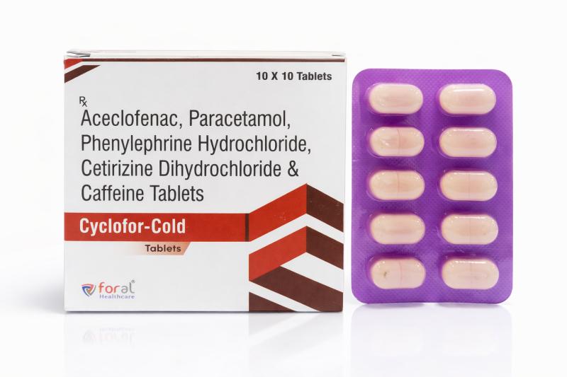 ACECLOFENAC 100MG + PARACETAMOL 325MG + CETIRIZINE DIHYDROCHLORIDE 10MG + PHENYLEPHRINE HYDROCHLORIDE 5MG + CAFFEINE (ANHYDROUS) 25MG